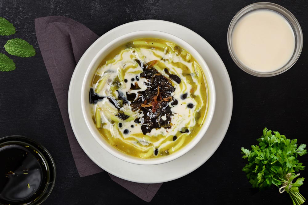 Our take on the classic Persian noodle soup. Includes a fragrant mixture of herbs (parsley, spinach, dill, coriander, and spring onions) along with noodles, chickpeas, red kidney beans, lentils, and dried mint then sealed off with kashk (thick whey). Legend has it that the noodles in this soup symbolize good fortune!