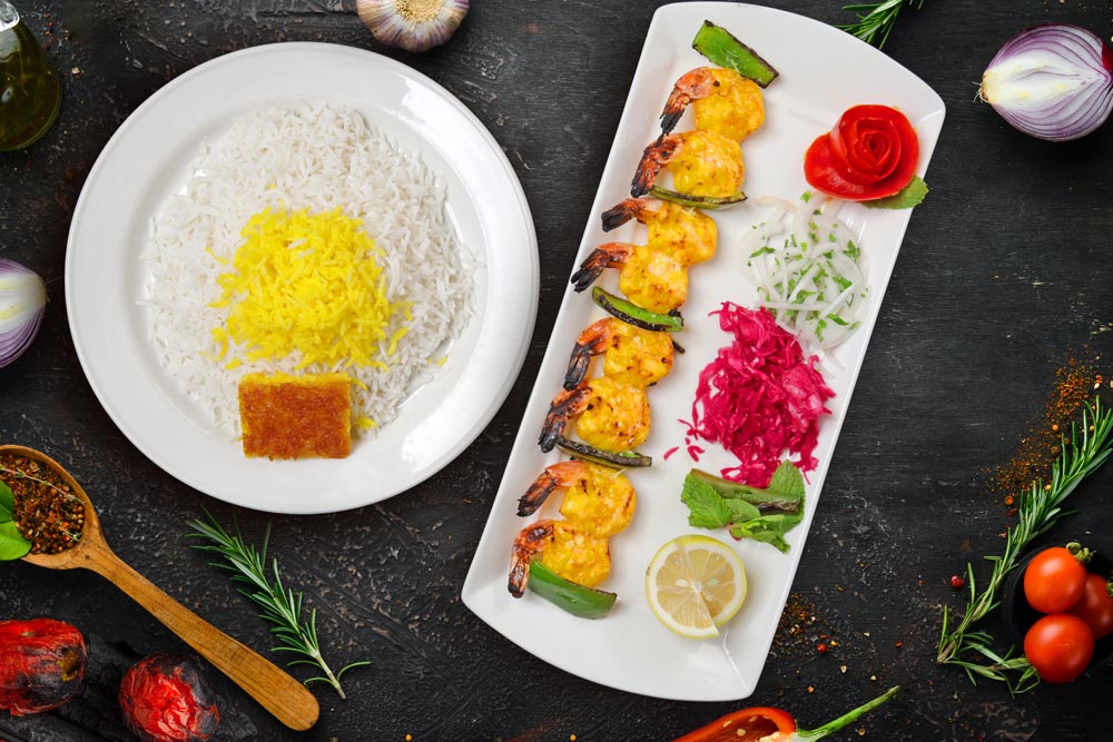 Tender marinated tiger shrimps, sliced, skewered and flame broiled, served with delicate saffron rice or french fries along with delicious tartar sauce.